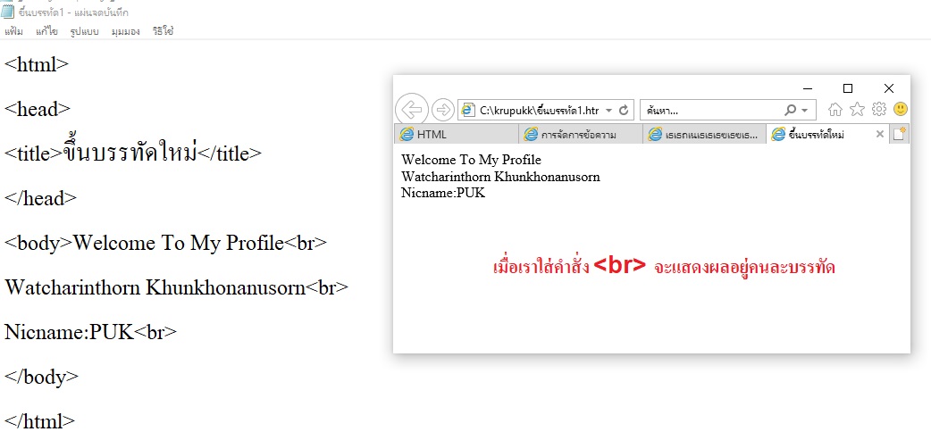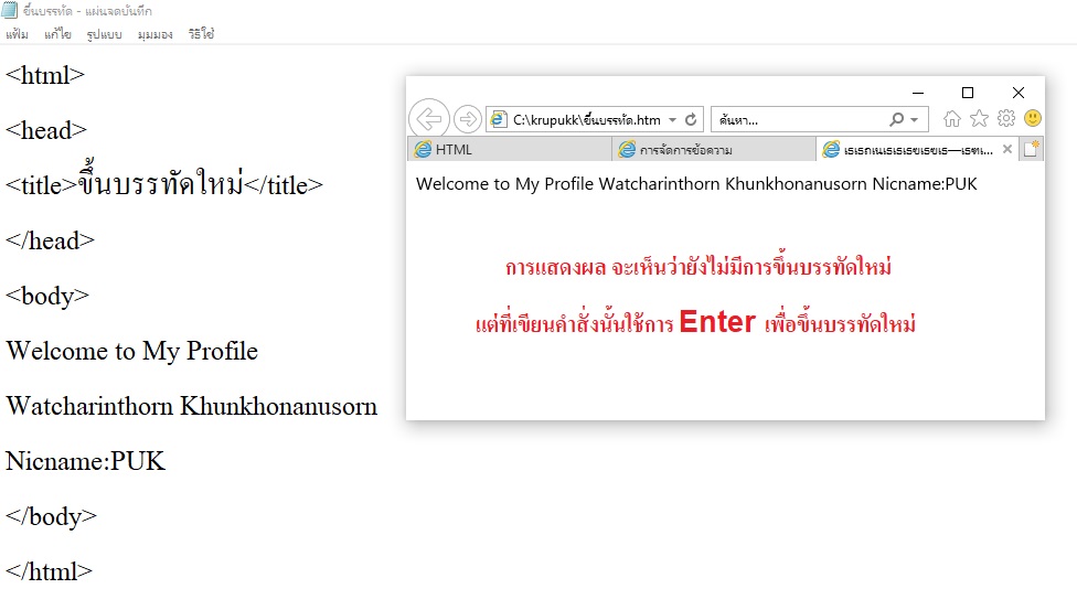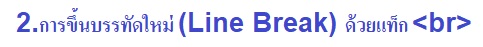 เมื่อต้องการขึ้นบรรทัดใหม่ ต้องใช้คำสั่ง เท่านั้น เพราะในภาษา HTML จะไม่รับรู้ว่า การกดปุ่ม Enter เป็นการขึ้นบรรทัดใหม่ มีรูปแบบดังนี้